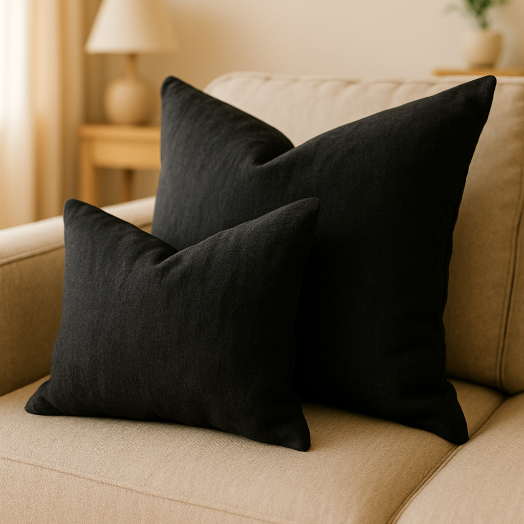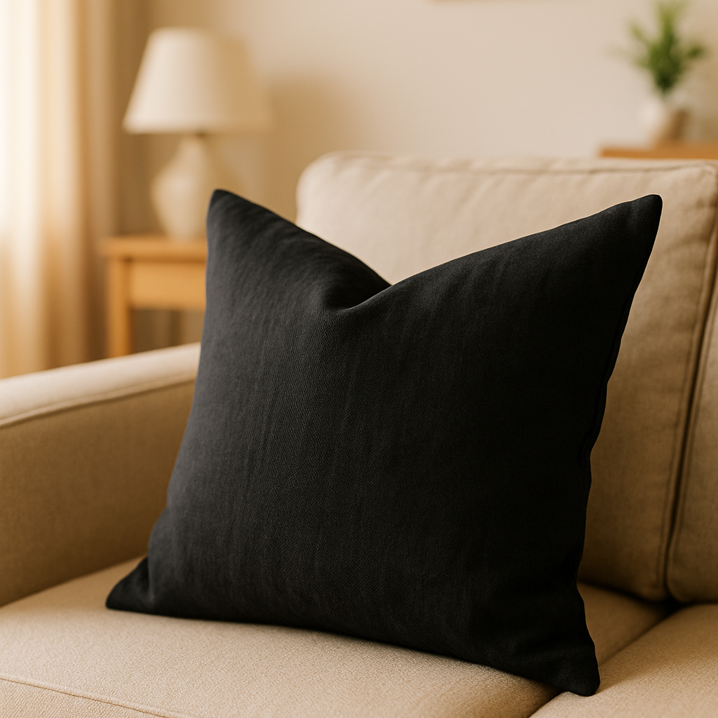 Black Linen Cushion Cover, a stylish and timeless decorative throw pillow case crafted from premium, breathable linen. Designed with a hidden zipper closure, it offers a seamless and elegant look while ensuring easy removal and cleaning. Perfect for living rooms, bedrooms, sofas, and cozy reading nooks, this versatile throw pillow cover adds warmth and sophistication to any space.